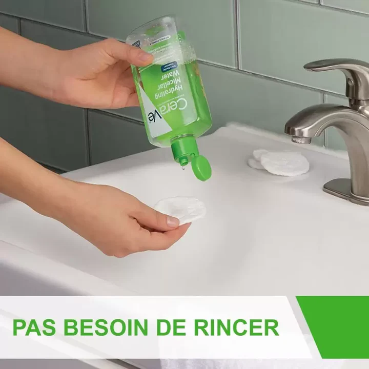 Cerave Eau Micellaire Nettoie et hydrate en douceur sans altérer la barrière protectrice de la peau.